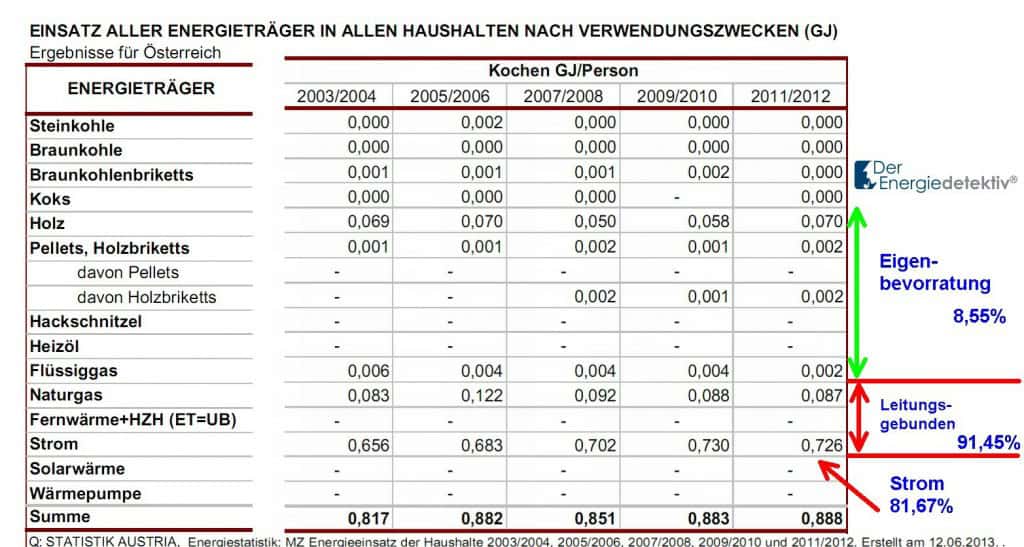 Laut Statistik Austria sind 81,67% des Energieverbrauchs (nicht der Anzahl!) der Haushalte beim Kochen von elektrischer Energie abhängig. Inklusive Gas sind 91,45% des Energieverbrauchs leitungsgebunden und nur 8,55% mit Energieträgern abgedeckt, die in Haushalten selbst bevorratet werden könnten. Wie die Eigenbevorratung tatsächlich aussieht wissen wir nicht.