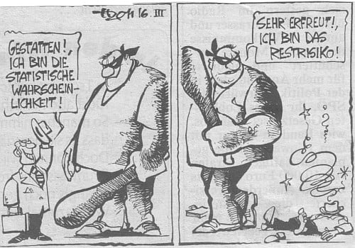 Wir „leisten“ uns doch tatsächlich eine Feuerwehr, investieren da in Gebäuden, Fahrzeugen, Materialien und zahlen sogar andauernd für das Vorhalten (und Ausbilden) von Personen, obwohl für ein einzelnes Gebäude keine Wahrscheinlichkeit eines Brandes angegeben werden kann. Unsere (zusammenfassende) Lebenserfahrung sagt uns, Brände kommen vor und je rascher eine tatsächlich vorhandene Feuerwehr eingreifen kann, um so eher können Menschenleben gerettet werden und um so geringer ist der Schaden. Wir haben noch keinen Brand erlebt. Allerdings in der Nachbarschaft. Und in den Medien wird immer wieder von Bränden berichtet. Zahlenangaben daraus zu ermitteln ist wie Kaffeesatzleserei. Die generelle Erfahrung lautet: Brände haben eine gewisse Eintrittswahrscheinlichkeit und das Vorhalten der Feuerwehr „lohnt“ sich.