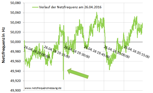 Bei Betrachtung eines längeren Zeitraums in folgendem Bild ist der Frequenzeinbruch wegen der kurzen Dauer kaum zu erkennen. Erst in dem nächsten Bild mit höherer zeitlicher Auflösung tritt er deutlich hervor.