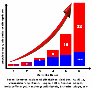 Phase 2: Die Stromversorgung funktioniert zumindest wieder in weiten Teilen, die anderen Infrastruktursektoren jedoch noch nicht oder nur eingeschränkt. Diese Phase kann je nach betroffener Infrastruktur Tage, Wochen und in Teilen sogar Monate (Ausfälle in der Tierhaltung) andauern. Die Phase 2 wird daher zu einer enormen gesellschaftlichen und wirtschaftlichen Belastungsprobe werden.