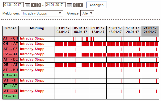 Hier die österreichischen Intraday-Stops im Jänner 2017. Fast durchgehend musste mit drei Kuppelstellen der Handel („Stop of Intraday trading due to critical load flows“) ausgesetzt werden. Strom ist genug da, aber er kann nicht, wie vom Markt gewünscht, transportiert werden!
