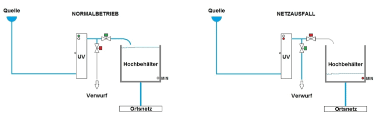 In jedem Wasser (auch im saubersten, gesunden Trinkwasser) kommen unterschiedliche Keime vor, welche aber nicht schädlich sind. Das Wasser wird durch UV-Desinfektionsanlagen desinfiziert (ultraviolettes Licht zur Desinfektion) und damit einer Infektion vorgebeugt. In Wasserversorgungsanlagen besteht daher die größte Gefahr durch den Ausfall der Spannungsversorgung (USV–Versorgung ist so gut wie nirgends vorhanden). Bei Stromausfall wird sofort die Zulaufklappe geschlossen und die Verwurfklappe geöffnet, die Befüllung des Hochbehälters wird unterbrochen. Die Klappen (oder Ventile) arbeiten entweder durch Luftdruck, angesteuert mittels Magnetventilen, oder sind reine Magnetventile, oder es handelt sich um Klappen mit notstromversorgtem Elektroantrieb.