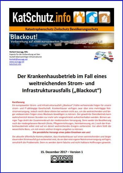 - Krankenhäuser sind daher trotz der verfügbaren mehrtägigen Notstromversorgung wie der Rest der Gesellschaft nicht auf einen weitreichenden Strom- und Infrastrukturausfall vorbereitet. Die Nachwirkungen einer solchen Katastrophenlage werden in der Regel unterschätzt. Die medizinische (Not-)Versorgung der Bevölkerung wird daher bereits nach wenigen Tagen nur mehr sehr eingeschränkt möglich sein.