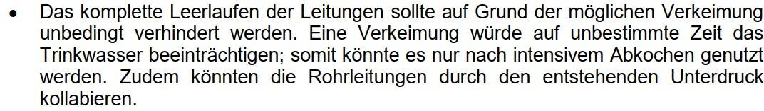 Diese Empfehlung ist fahrlässig und führt zu massiven Problemen in der Wasserversorgung, bis hin zu möglichen Infrastrukturschäden! Sollte es auch nur zu Lufteinschlüssen kommen, müssen die Pumpen aufwendig entlüftet werden. Die Versorgung bricht zusammen!