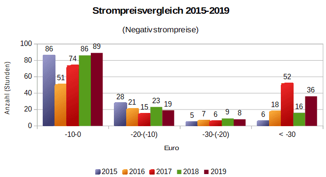 - Am Pfingstsamstag gab es einen neuen Rekord mit Negativpreisen am deutschen Strommarkt. Während 19 Stunden lag der Strompreis bei -60 Euro. Sprich, Großabnehmer haben sogar für die Stromabnahme bezahlt bekommen. Gleichzeitig gab es damit 2019 bereits mehr Stunden mit Negativpreisen (136), als im gesamten letzten Jahr (134). Nur das bisherige Rekordjahr 2017 mit 147 Stunden wurde noch nicht geknackt.