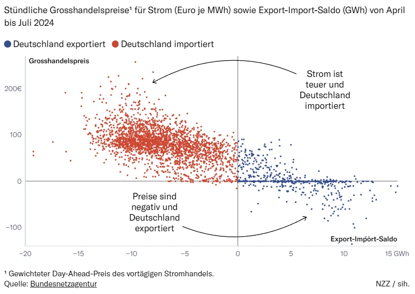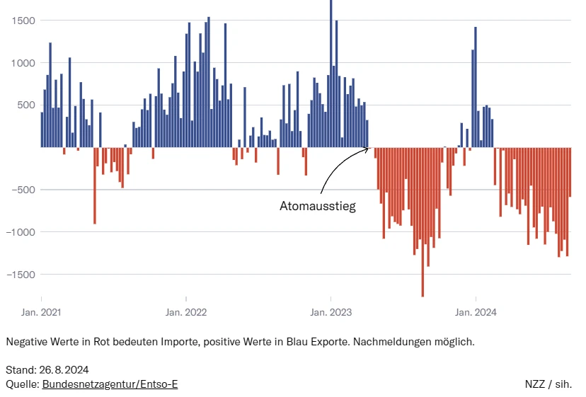 Eine Auswertung der Denkfabrik Agora Energiewende zeigt, dass sich seit dem Atomausstieg die Atomstrom-Importe aus Deutschlands Nachbarländern im Schnitt mehr als verdoppelt haben. Wichtig sind Importe für Deutschland vor allem dann, wenn die wetterabhängige Erzeugung aus Wind und Sonne schwächelt. Daher sind diese häufig teuer, Deutschlands Exporte hingegen eher billig. Wegen fehlender Speicher muss das Land seinen Strom sogar verschenken, insbesondere in den Sommermonaten.