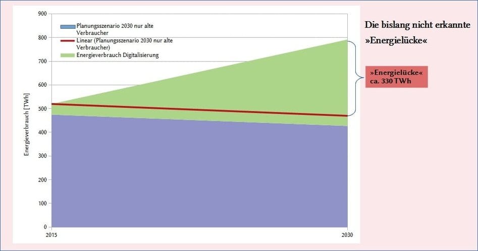 Löst man nach den verfügbaren Ausgangsdaten den Stromanteil für Digitalisierung heraus, der im Ausgangsjahr 2015 bei ca. 45 TWh gelegen haben dürfte, belässt man das Einsparungspotential beim Rest von Industrie und „Gebäude“ und leitet für die Digitalisierung ein Zuwachsszenario ab, dass den mittleren Wachstumserwartungen der Branche entspricht, haben wird für 2030 plötzlich nicht mehr eine Reduzierung von 520 auf 470 TWh, sondern eine Erhöhung von 520 auf 800 TWh – oder anders formuliert eine Energielücke von 330 TWh aufgrund des Wachstums der Digitalbranche. Dabei sind schon zunehmende Energieeffizienzeffekte bei der Digitalisierung berücksichtigt. Diese Zahlen beruhen auf einem eigenen von mir erstellten Berechnungsmodell, das mittlerweile von mehreren Energieexperten validiert wurde.