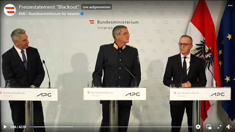 Innenminister Karl Nehammer hat am 27. September 2021 gemeinsam mit den beiden Vorständen der „Austrian Power Grid“ (APG), Gerhard Christiner und Thomas Karall, eine Vereinbarung zur Blackout-Vorsorge unterzeichnet. Damit wurde die langjährige Zusammenarbeit in der APG-Steuerungszentrale festgehalten. Die Kooperationsvereinbarung regelt das konkrete Vorgehen im Falle eines Blackouts. Während die APG für die sichere Stromversorgung und im schlimmsten Fall für den Wiederaufbau des Stromnetzes zuständig ist, muss die Polizei im Krisenfall weiter für Sicherheit der Bevölkerung sorgen. Außerdem muss das BMI als Sicherheitsministerium die Maßnahmen der Behörden bei Krisen und Katastrophen koordinieren.