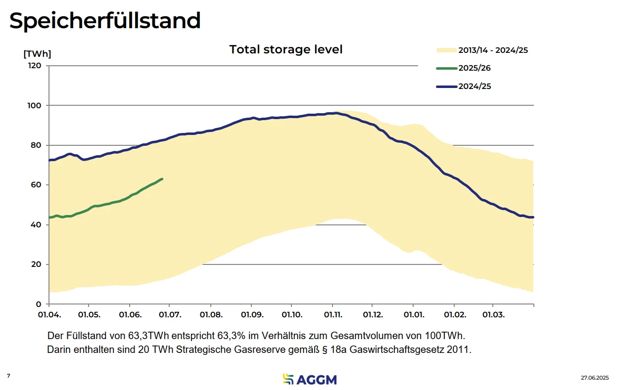 Der Füllstand der Speicher OMV Gas Storage, RAG Energy Storage und Uniper Energy Storage liegt mit Stand 23. August 2022 bei 50,9 TWh, das entspricht 66,2% [Stand 05.09.22: 68,41 %] im Verhältnis zum Gesamtvolumen dieser Speicherunternehmen von 76,9 TWh. In diesen Zahlen sind derzeit auch jene Gasmengen enthalten, die bei RAG Energie Storage im Speicher Haidach eingespeichert sind, weil RAG derzeit die hinzugekommen Haidach-Mengen im „RAG Speicherpool“ angibt, auch wenn die Speicheranlage Haidach derzeit noch über keine direkte Anbindung an das österreichische Gasnetz verfügt. Aus diesem Grund können die Speicherstände für MG Ost derzeit nicht gesondert ausgewiesen werden. RAG wurde bereits zur Umstellung der Meldung aufgefordert, diese sollte zeitnah erfolgen.