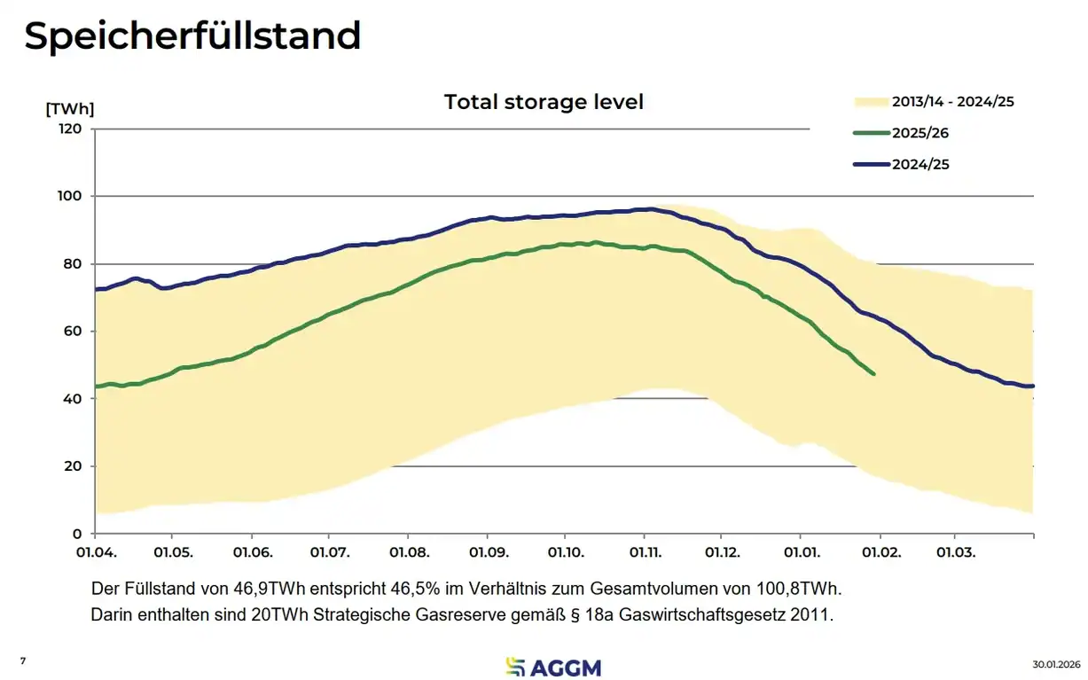 01.02.26: Die deutschen Gasspeicher waren am 31.01.26 noch zu 33 % gefüllt. Besonders problematisch ist die Speichersituation in Bayern mit knapp über 20 %.