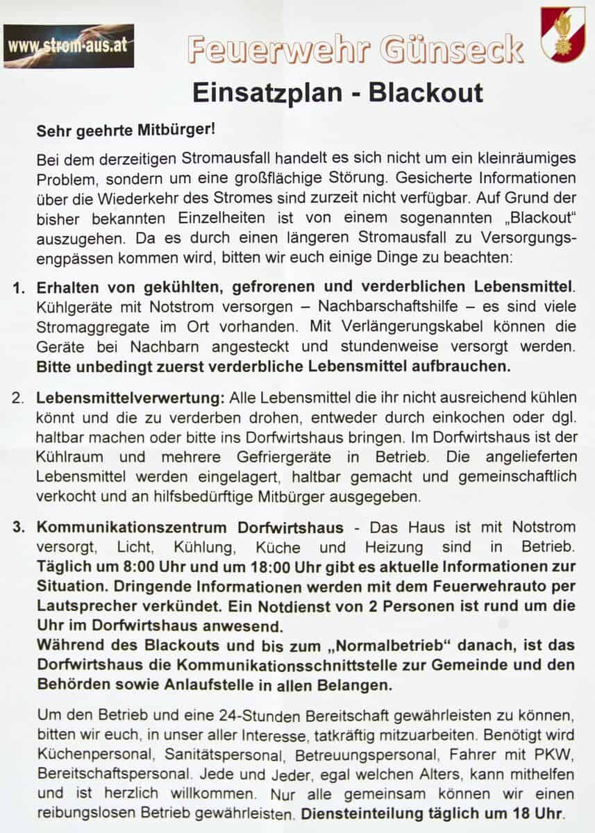 Großflächigen Stromausfall mit Zusammenbruch wichtiger Infrastruktureinrichtungen will niemand – aber der „Blackout“ steht laut Experten bald vor der Tür. Ohne Strom funktioniert kein Handy, kein Internet, keine Öl-Zentral-Heizung, kein Bankomat und sogar das Wasser hört auf zu rinnen. In einem solchen Szenario wird Günseck vorerst das Feuerwehrhaus und Dorfwirtshaus mit Notstrom versorgen – dadurch wären Licht, Kühlung, Küche und Heizung in Betrieb – danach wird die Bevölkerung mit Informationen und detaillierten Einsatzplänen ausgestattet.