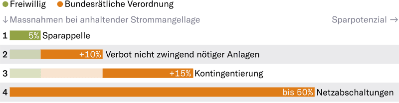 Zuerst kommen die Sparappelle und die freundlichen Tipps. Dann werden vielleicht Rolltreppen abgestellt oder Schneekanonen. Anschliessend müssen Grossverbraucher ihren Konsum zurückfahren. Und wenn das alles immer noch zu wenig bringt, dann werden ganze Teile des Landes einfach stundenweise abgeschaltet.