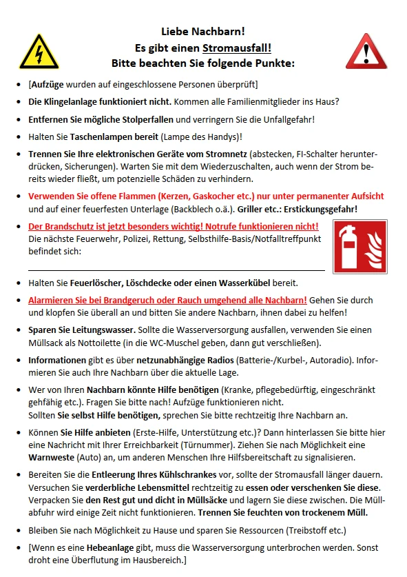 - Wer von den Nachbarn könnte Hilfe benötigen (Kranke, pflegebedürftig, eingeschränkt gehfähig etc.). Fragen Sie bitte nach! Aufzüge funktionieren nicht. Sollten Sie selbst Hilfe benötigen, sprechen Sie bitte rechtzeitig Ihre Nachbarn an.