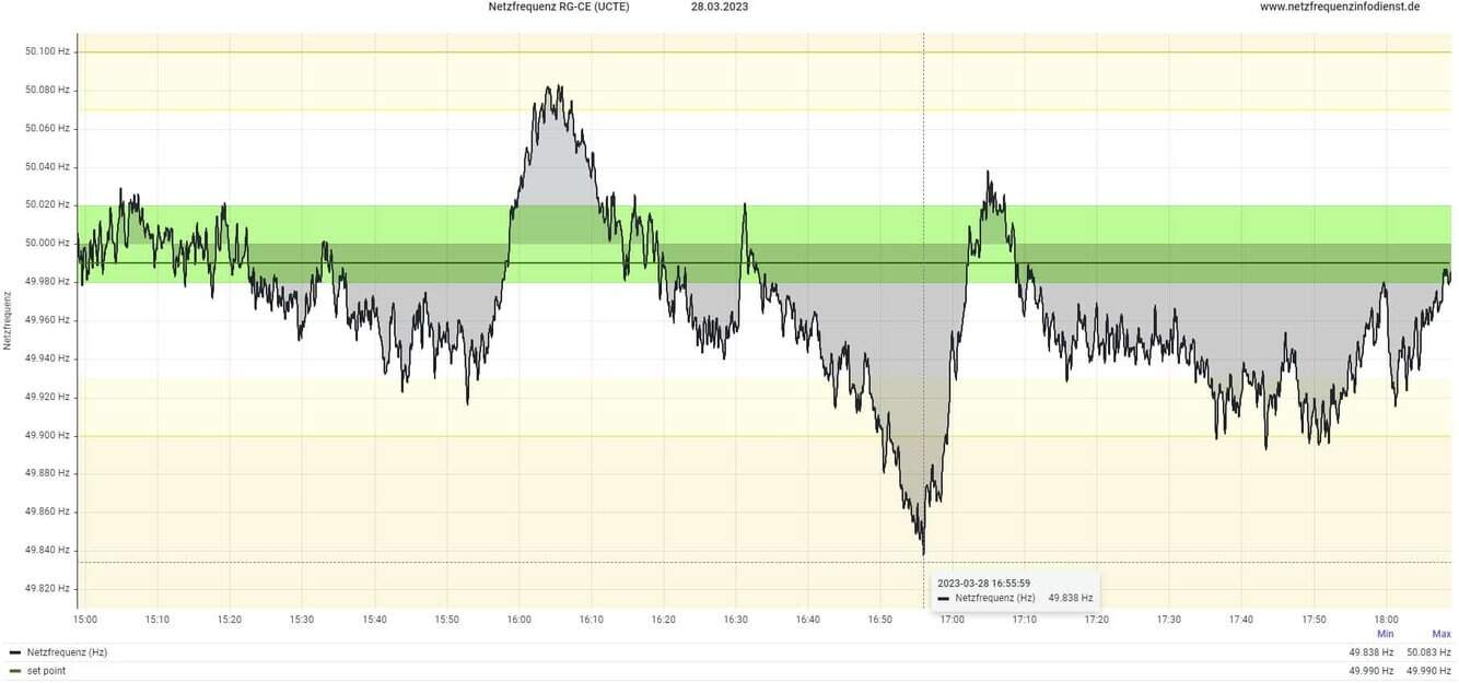 Mittlerweile gibt es eine Häufung von Ereignissen mit bis zu 50 Minuten und den Ausreißer am 25. März mit 95 Minuten. Am 28. März kam es zudem erstmals seit dem 20. April 2022 wieder zu einem Einbruch auf 49,84 Hertz und einer mehrstündigen Unterdeckung.