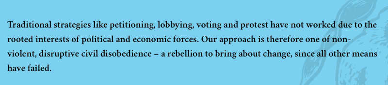 »Traditionelle Strategien wir Petitionen, Lobbying, Wahlen und Proteste haben aufgrund der tief verankerten Interessen von politischen und ökonomischen Kräften nicht funktioniert. Unser Vorgehen ist daher gewaltfreier, disruptiver ziviler Ungehorsam — eine Rebellion um Änderungen herbeizuführen, zumal alle anderen Mittel versagt haben«, Extinction Rebellion global, Website (Hervorhebungen von mir)
