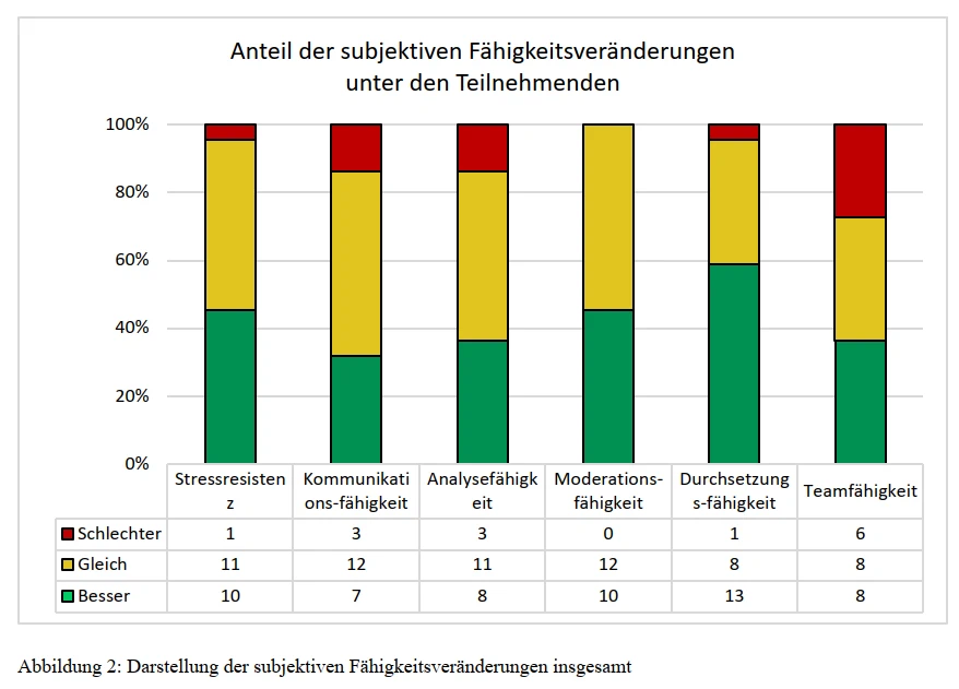 Mit Hilfe des Fragebogens konnte nur teilweise nachgewiesen werden, dass die Fähigkeiten, die betrachtet wurden, sich subjektiv verbessert haben. Das Ergebnis fiel für die Stressresistenz, das Durchsetzungsvermögen und die Moderationsfähigkeit positiv aus. Es konnte zwar keine signifikante Verbesserung der Selbsteinschätzung für die Kommunikations-, Team- und Analysefähigkeit festgestellt werden, jedoch konnte durch die Beobachtung der Verhaltensweisen der Teilnehmenden ein Fortschritt für diese Fähigkeiten wahrgenommen werden.