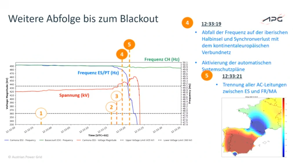 Während sich das europäische Verbundnetz stabilisierte, konnte auf der Iberischen Halbinsel die plötzlich benötigte fehlende Leistung nach der Netzschutzabschaltung der Verbindungsleitungen nicht mehr über Frankreich importiert werden.