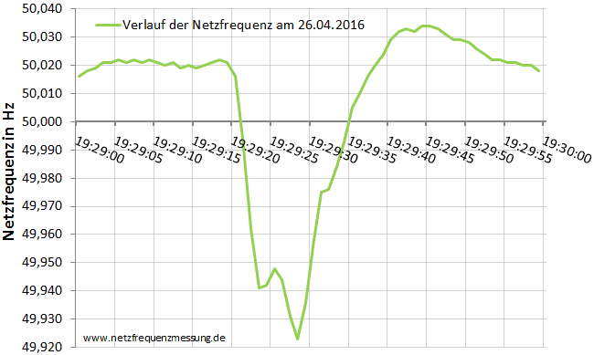 19:29:53 Frequenz erreicht nach einem Überschwinger auf +13 mHz wieder den ursprünglichen Wert
