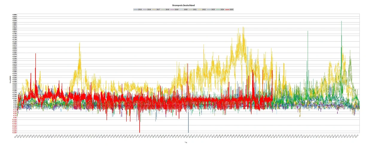 Hier werden die deutschen Strompreise ausgewertet. Eigene Darstellung, Datenquellen: www.epexspot.com | SMARD | Strompreis Download. Die Detailtabellen sind am Ende dieser Seite zu finden.
